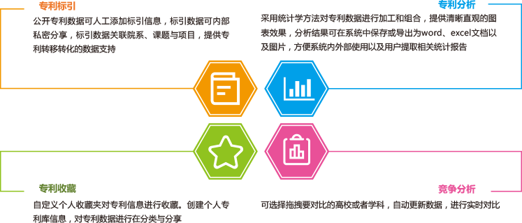 专门为高校定制的专利数据库。涵盖本校独立申请及联合申请的全球全部公开专利,数据每周更新。高校知识产权信息服务中心可以对数据进行管理,支持在线标引、下载、分析、收藏、对比等功能,提供统一报表格式,方便数据报送,各种维度的数据分析图表,方便学校专利管理和课题组及时跟进专利情况,有利于重大科研项目申报支持及研发过程中的数据统计。