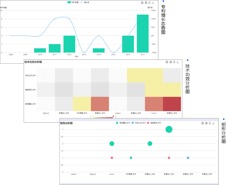 提供检索结果的精准分析,多维度可视化分析,清晰直观的图表展示,包括柱状图、折线图、饼图、气泡图、热力图、矩阵图、非三维专利地图等。